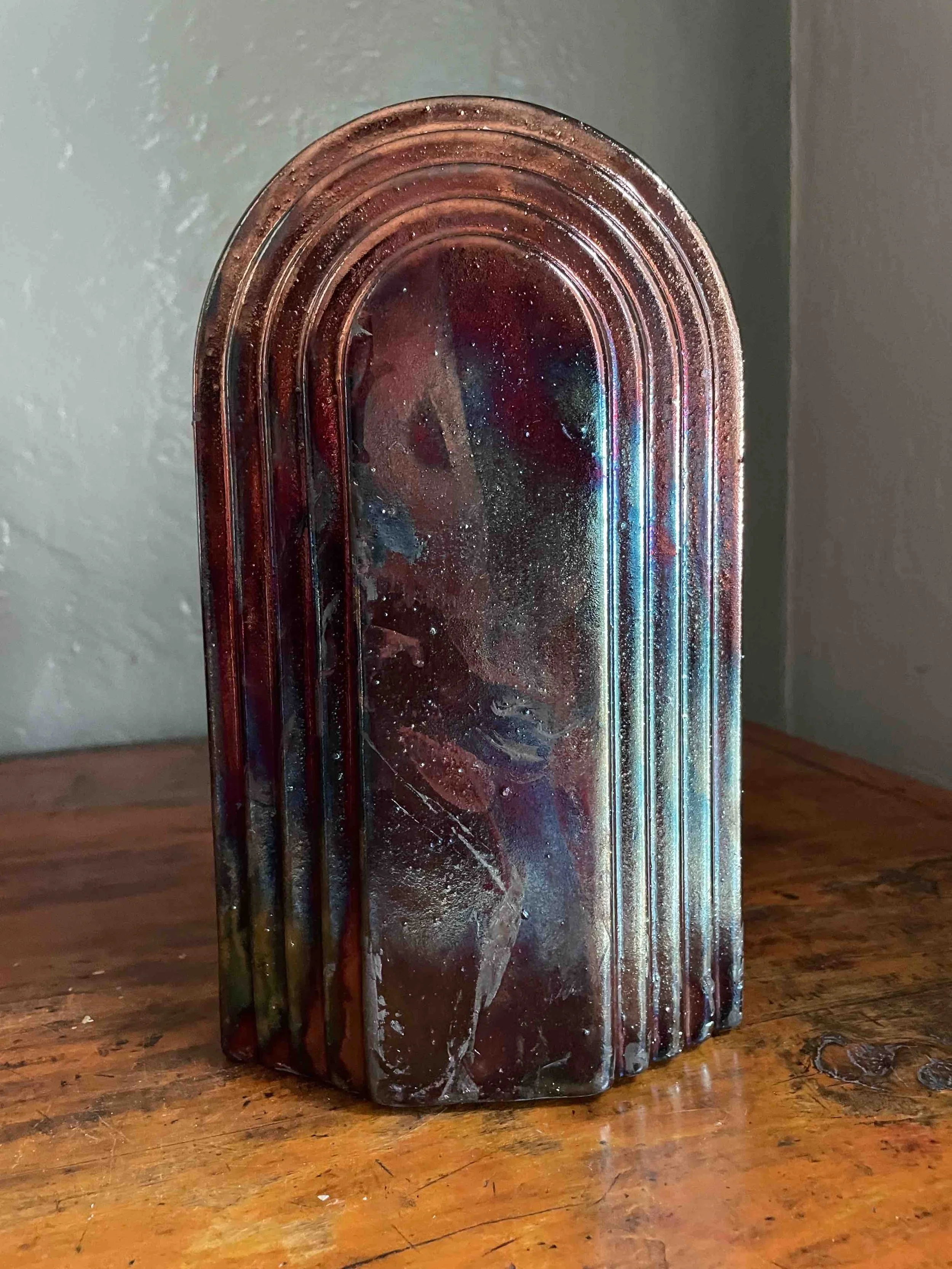 This is a one-of-a-kind Raku fired vessel that is hand made using slip casting techniques. It is decorated with a Copper Raku glaze with a rare blue flash up the center that was crated by a flame that hit it during the firing process The form is mirrored on both sides. It is not water safe.