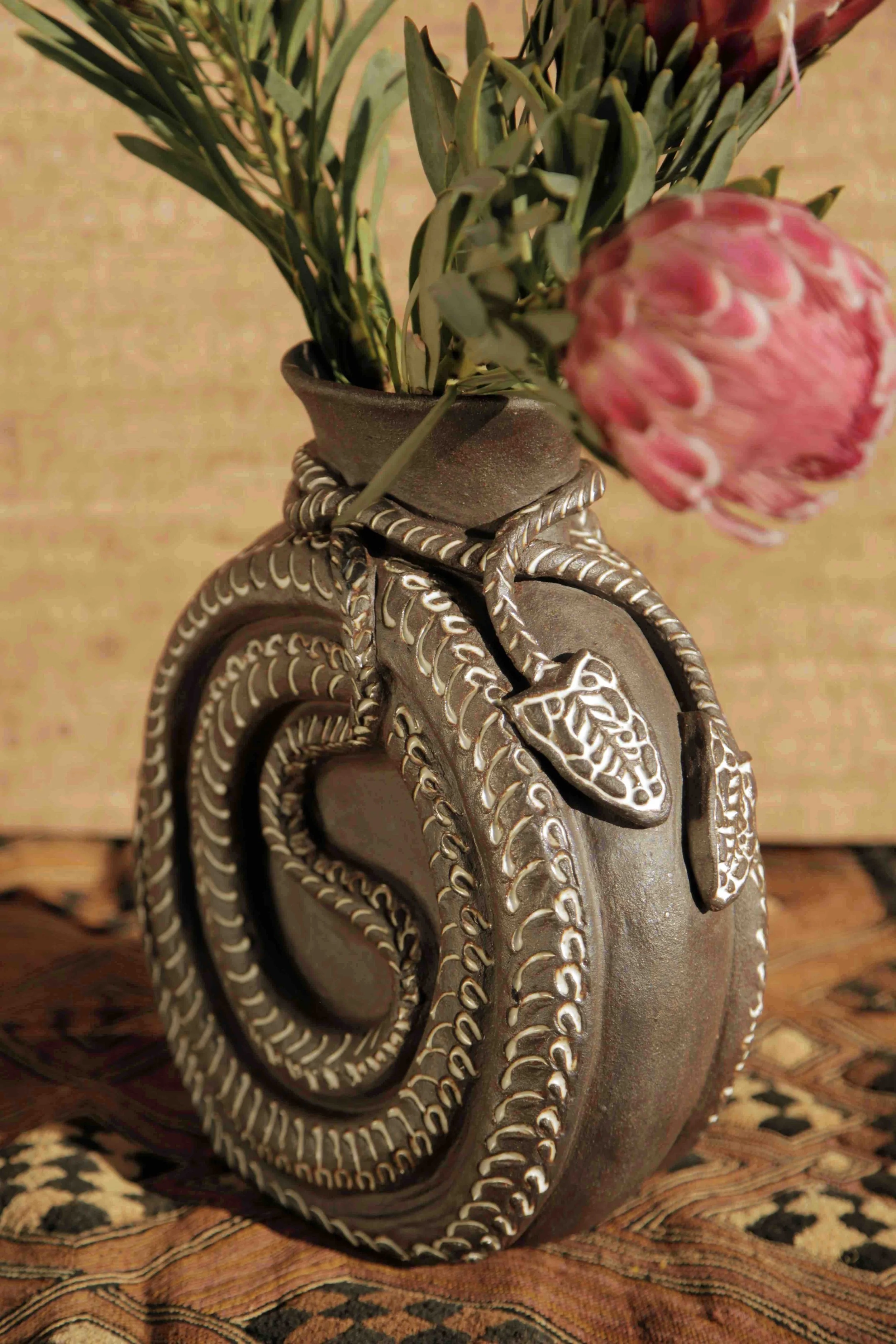 This is a one-of-a-kind, water safe, vessel. It has two serpent skeletons that wind up it and intertwine at the neck. It is handbuilt using slab building techniques and meticulously decorated by hand.