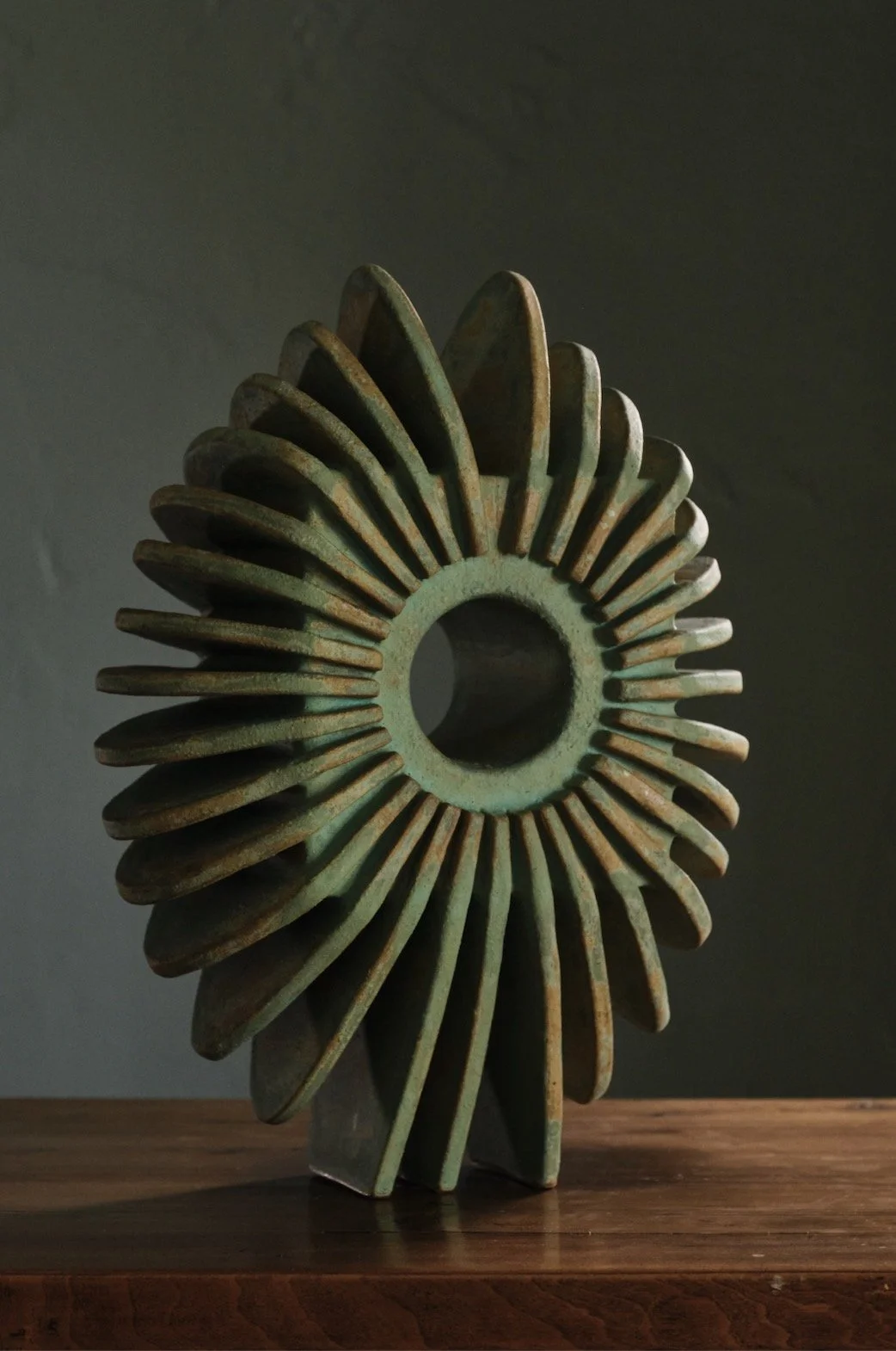 This sculpture is handbuilt by using slab building techniques. It is hand decorated with a variety of layered glazes to mimic weathered bronze.